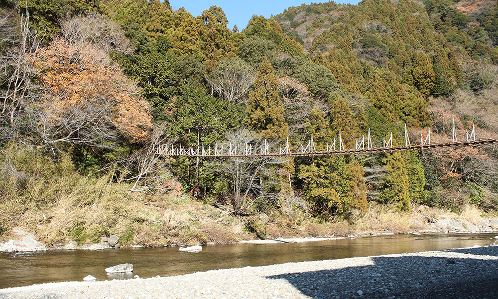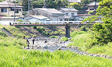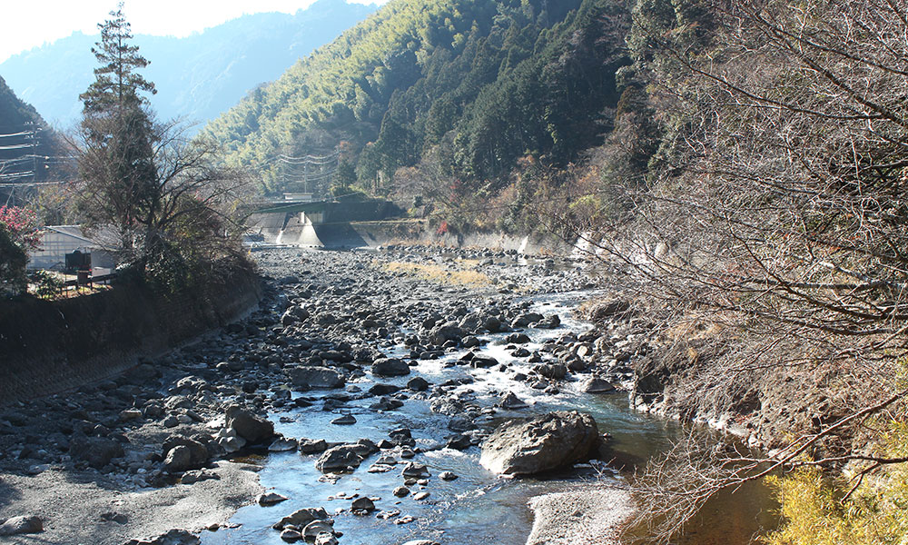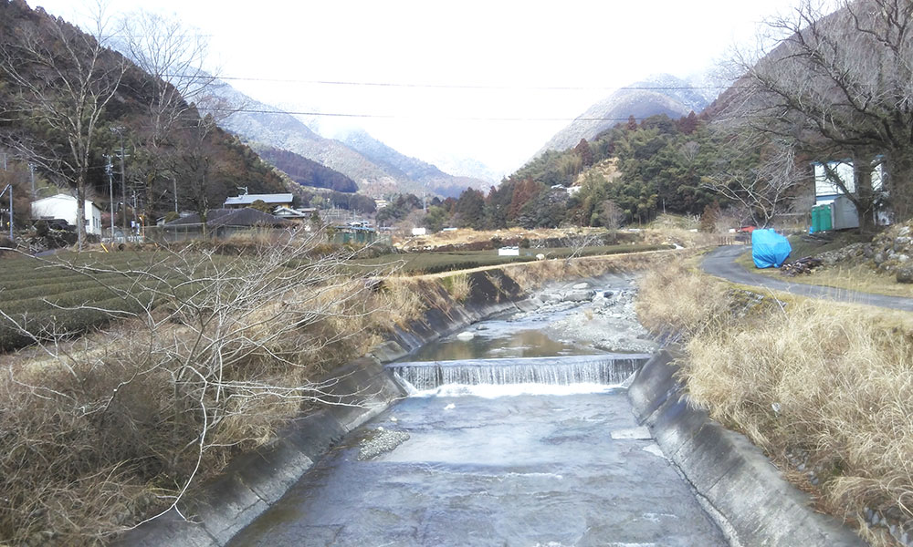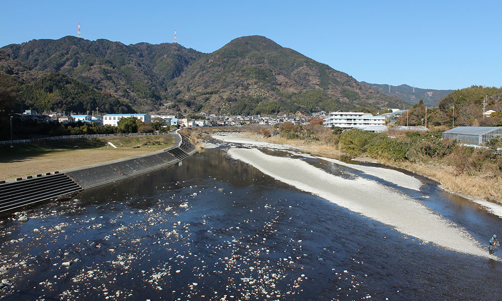 興津川は、静岡市清水区と山梨県との県境の田代峠からいくつかの支川を合わせながら、駿河湾へ注いでいます。総延長は52km、流域面積は約120平方kmです。川が短いわりに勾配が急なため大雨が降るとすぐに水が増えますが、水がひくのが早いというのが特長です。興津川流域の約68%は森林で、その他はみかん畑や茶畑が見られます。特に両河内地区のお茶、竹の子、わさびは味が良いことで全国的にも有名です。